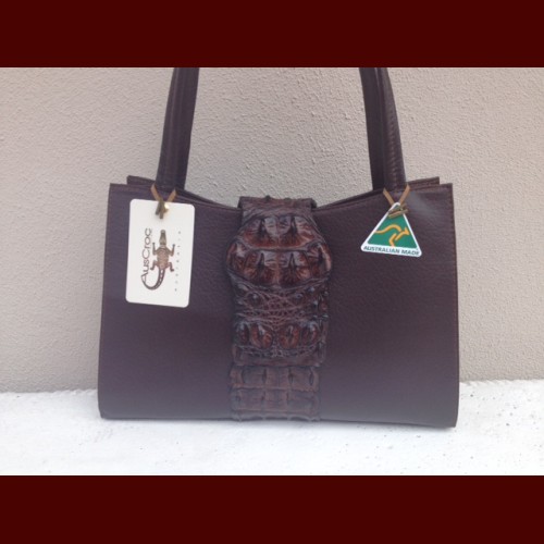 This beautiful handbag is handcrafted in Australia from cow or kangaroo leather hide with a crocodile Backstrap feature on the front and back.